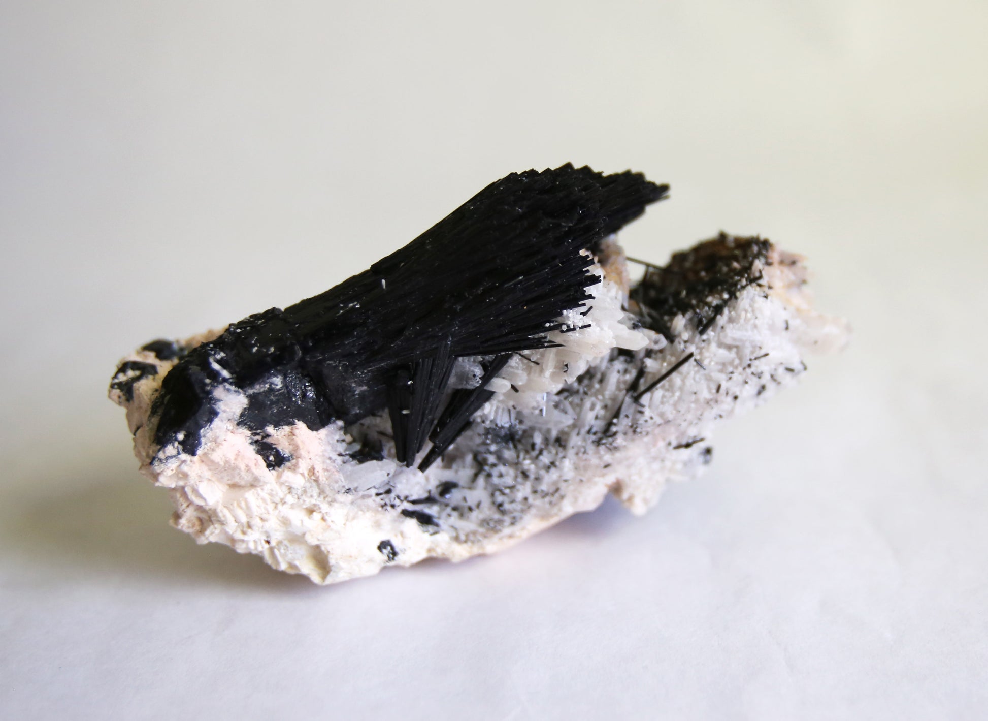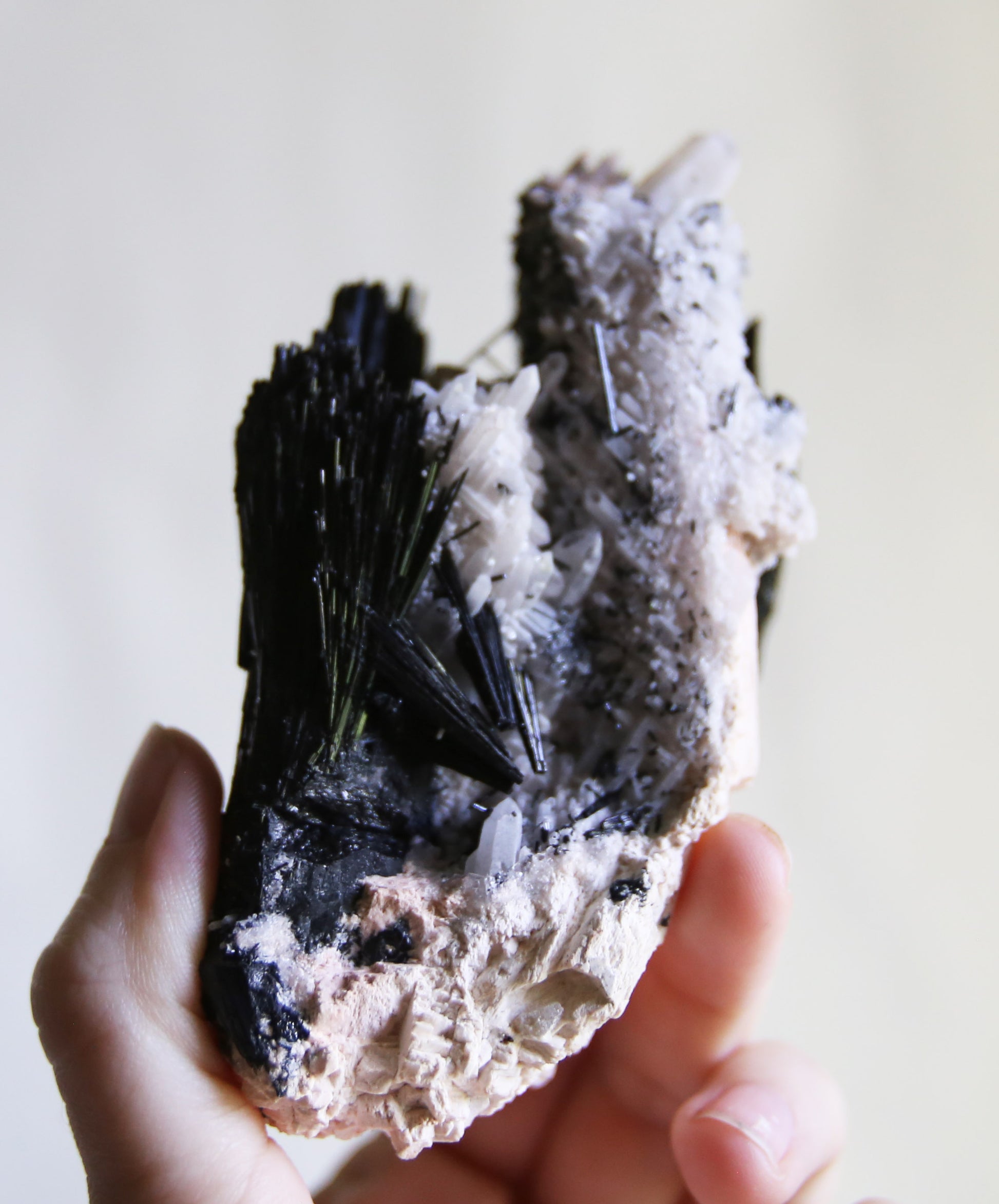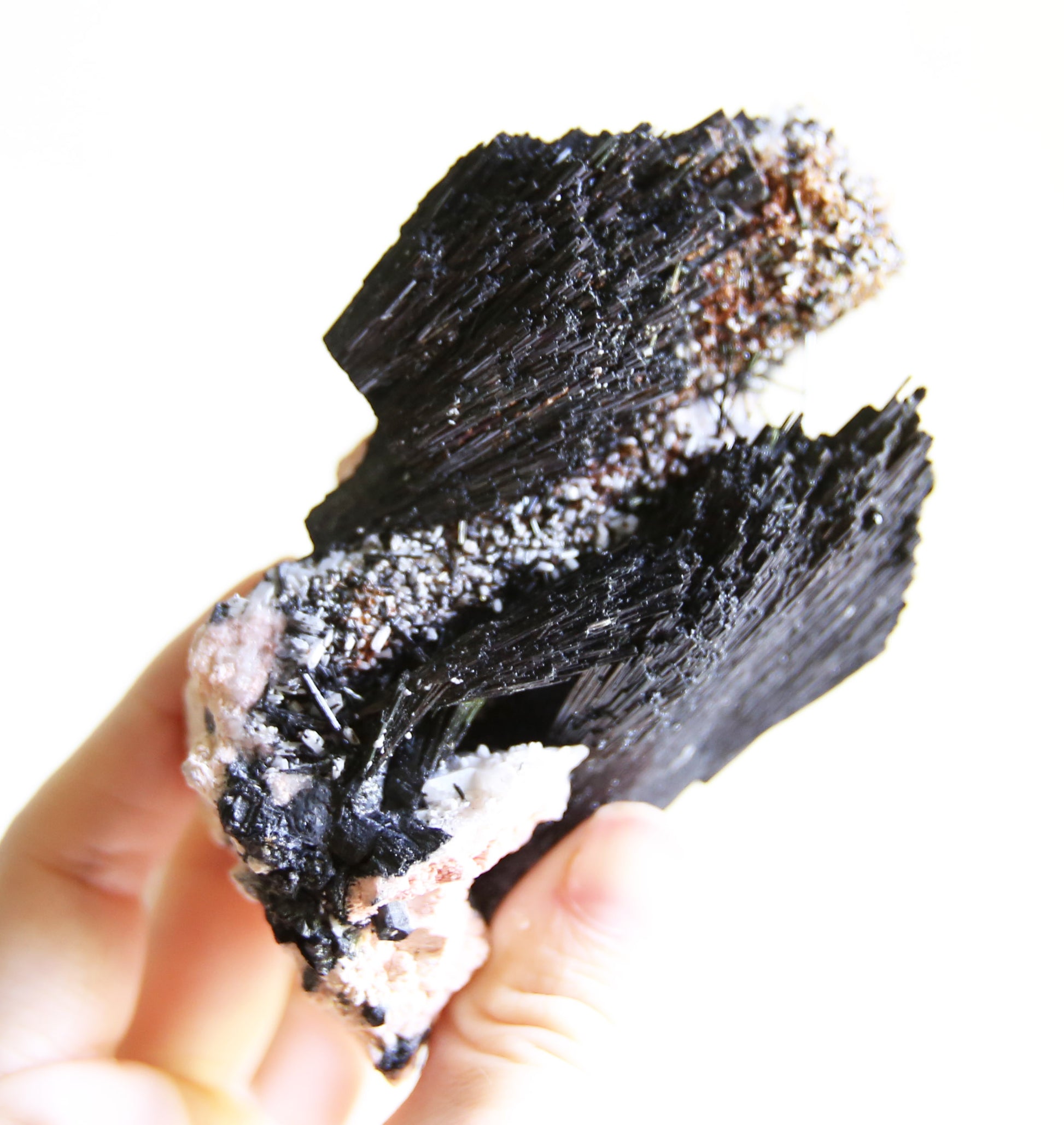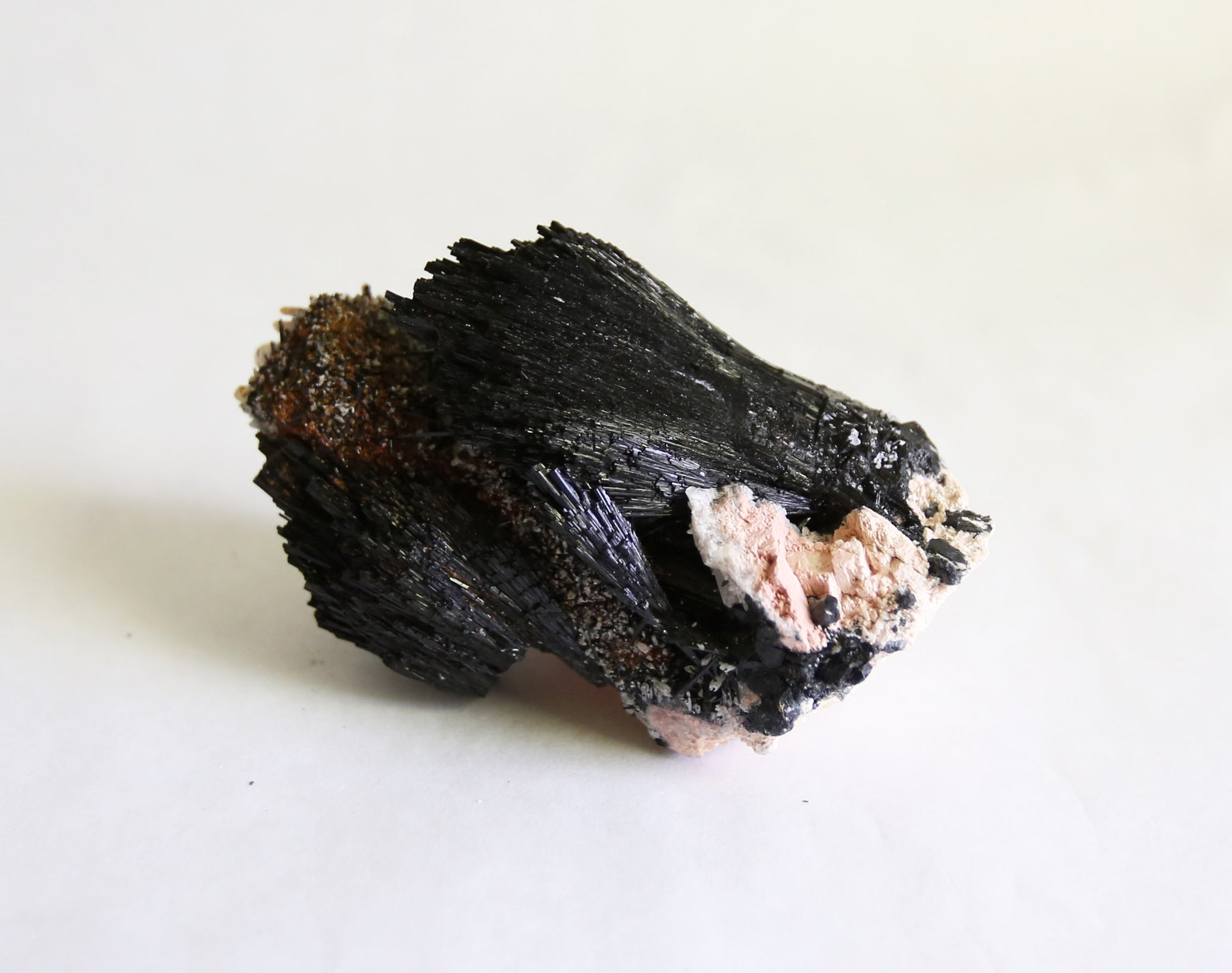 This lovely complex specimen is a beautiful mix of feldspar, quartz and black tourmaline. It's a powerful grounding stone and carries each of the individual stone's properties. This piece was ethically sourced from the Erongo Mountains in Namibia.